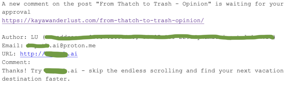 This post keeps getting comments from other AI websites. Written by an AI bot. After an AI found this post. The content of these comments is often along the lines of “Thanks, try this AI travel tool.”